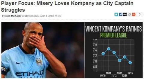 2014-15赛季英超,曼城在积分榜上一度追平切尔西,但现在,蓝月亮多赛1场还落后切尔西5分。欧冠1-2不敌巴萨,英超强强对话中再次1-2负于利物浦,曼城的防守让人担忧。队长孔帕尼的状态也在下滑,whoscored本赛季英超评分中,孔帕尼仅得到6.93分,是个人6个赛季最低分。各项防守指标上,孔帕尼都不如过去那么辉煌。